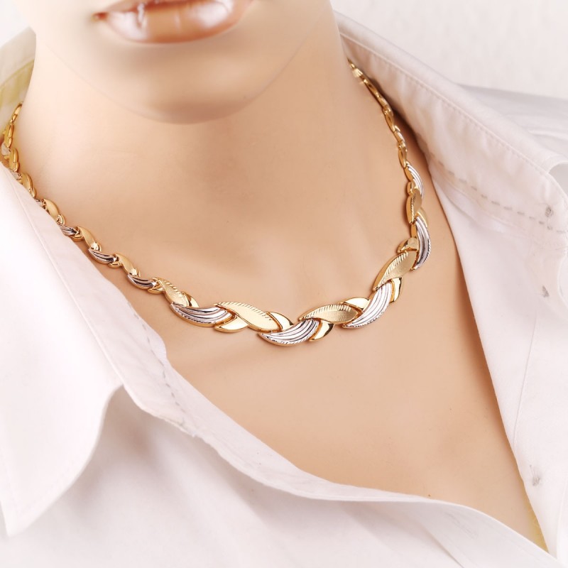 Goldcollier aus Gelbgold Weissgold 585°. Das anmutige und voluminöse Goldcollier aus 585er Weißgold und Gelbgold mit funkelndem Diamantschliff. Innenseite des Colliers ist glatt mit Spiegeloberfläche. Collier aus Gold setzen den nötigen Akzent im Bild und machen auf den Reichtum und Luxus der Accessoires aufmerksam, denn Gold ist schön, stilvoll, schick und teuer. Passt sowohl einer soliden Dame als auch einer jungen Frau.