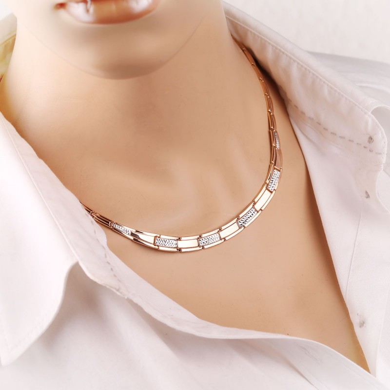 Rotgold mit funkelndem Diamantschliff. Innenseite des Colliers ist glatt mit Spiegeloberfläche. Collier aus Gold setzen den nötigen Akzent im Bild und machen auf den Reichtum und Luxus der Accessoires aufmerksam, denn Gold ist schön, stilvoll, schick und teuer. Passt sowohl einer soliden Dame als auch einer jungen Frau.