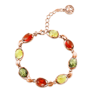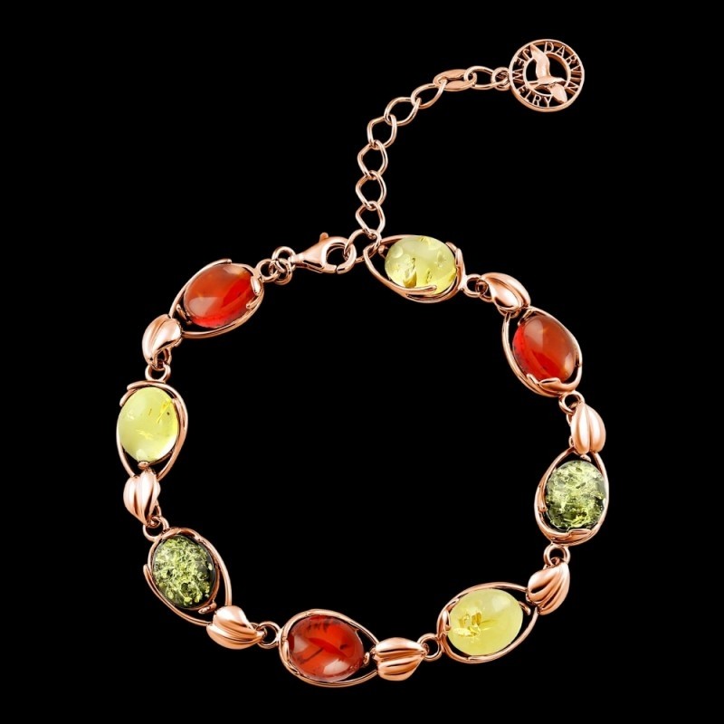 Ein festliches feminines Armband aus vergoldetem 925er Silber verziert mit Bernstein, mit diesem erstaunlichen "Stück der Sonne", in allen Schattierungen von Grün, Honig und Rot spielt, verzaubert und mit seiner Schönheit besticht, wird Sie immer wieder begeistern! Eine einzigartige Gelegenheit, Ihre Individualität zu betonen, das Bild von Weiblichkeit und Zärtlichkeit zu vermitteln. Eine schöne Kombination aus glitzerndem Gold und sonnigem Bernstein verleiht Ihrem Look eine festliche Stimmung!