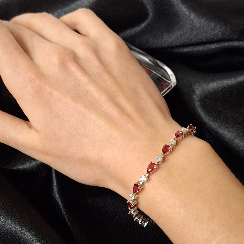 Zartes, feminines Armband aus 925er Sterlingsilber in ausgefallener Flechtung, mit Einsätzen aus funkelnden Zirkonia in ungewöhnlicher Form und bezaubernden Rubelliten! Eine einzigartige Gelegenheit, Ihre Individualität zu betonen, das Bild von Weiblichkeit, Originalität und Zärtlichkeit zu vermitteln.