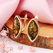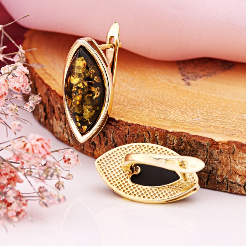 Bezaubernde Ohrringe aus 925er-Sterlingsilber mit gelber Vergoldung und Einsätzen aus Bernstein, dieses erstaunliche „Stück Sonne“, das mit allen Grüntönen spielt. Gelbvergoldung und grüner Bernstein sind eine erstaunlich harmonische Farbkombination. Eine einzigartige Gelegenheit, Ihre Individualität zu betonen und ein Bild von Weiblichkeit, Sonnenschein und Zärtlichkeit zu vermitteln.