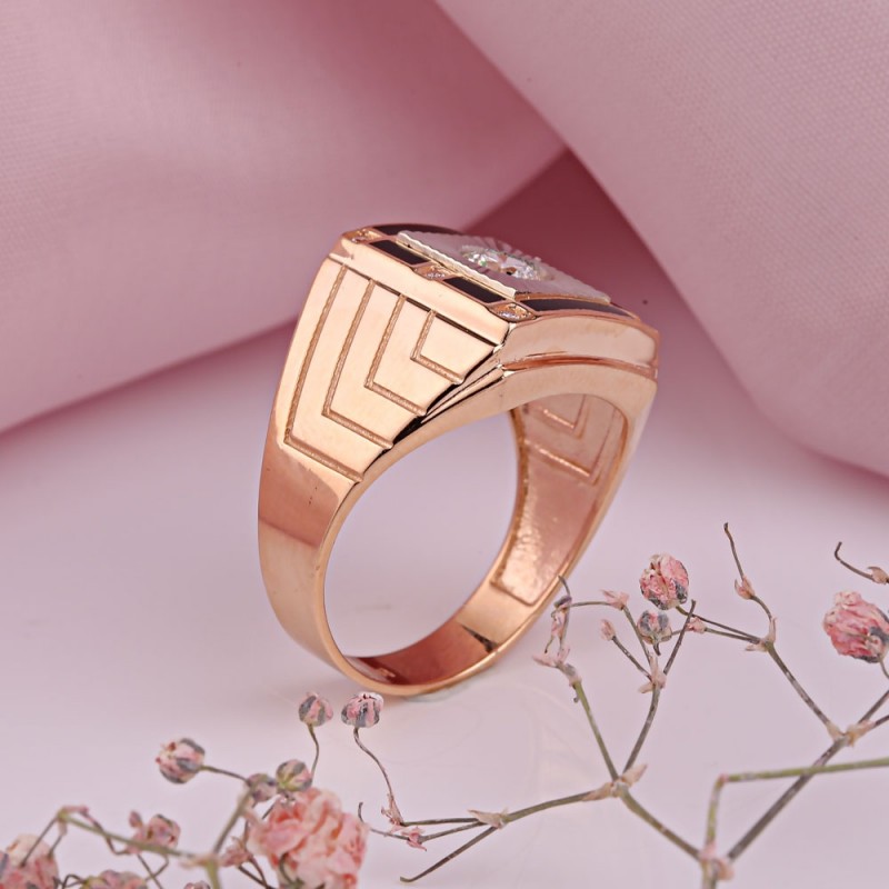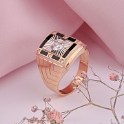 Herrenring aus Gold in Deutschland Zirkonia. Stilvoller Herrenring aus 585er Rotgold mit Weißgoldeinsätzen, der Akzente setzt und den Charme der Steine ​​hervorhebt. Die obere Plattform ist mit einem dekorativen Einsatz aus Zirkonia und schwarzer Emaille verziert. Auf der inneren, geschlossenen Oberfläche des Ringes ist ein Stempel mit Goldpunze angebracht.