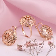 Rotgold, bestehend aus Ring und Ohrringe. Durch das Diamantschliff des Produkts entstehen feinste Muster auf dem Metall. Das Lichtspiel und das interessante Design erwecken den Eindruck, dass Sie ein Produkt mit Einsätzen aus echten Diamanten vor sich haben.