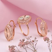 Set aus 585° Rotgold russisches Gold in Deutschland kaufen. Filigranes Set aus 585 Rotgold, bestehend aus Ring und Ohrringe. Durch das Diamantschliff des Produkts entstehen feinste Muster auf dem Metall. Das Lichtspiel und das interessante Design erwecken den Eindruck, dass Sie ein Produkt mit Einsätzen aus echten Diamanten vor sich haben.