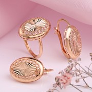Set aus 585° Rotgold russisches Gold in Deutschland kaufen. Filigranes Set aus 585 Rotgold, bestehend aus Ring und Ohrringe. Durch das Diamantschliff des Produkts entstehen feinste Muster auf dem Metall. Das Lichtspiel und das interessante Design erwecken den Eindruck, dass Sie ein Produkt mit Einsätzen aus echten Diamanten vor sich haben.