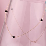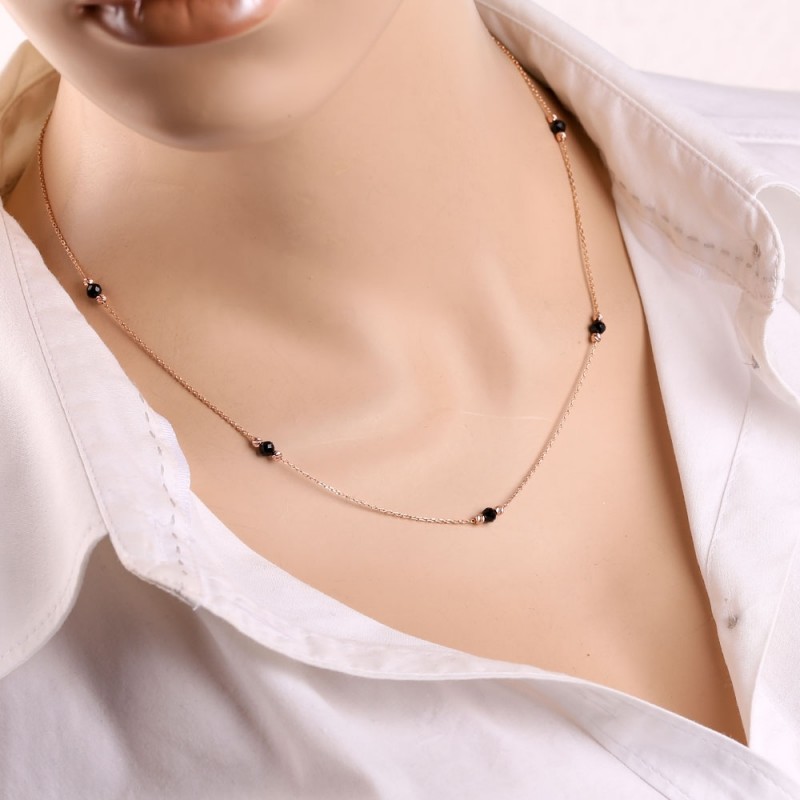 Goldcollier Russisches Gold 585 in Deutschland Achat schwarz. Zartes und romantisches Goldcollier aus 14 Karat Rotgold, verziert mit goldenen diamantgeschliffenen Zierperlen und schwarzen Achat. Kette - Ankergeflecht mit Diamantschliff. Wenn Sie bei Ihrer Begleiterin ihre Weiblichkeit, Anmut, ihr Lächeln und ihre Schönheit betonen möchten, dann ist ein solches Geschenk genau das Richtige für Sie.