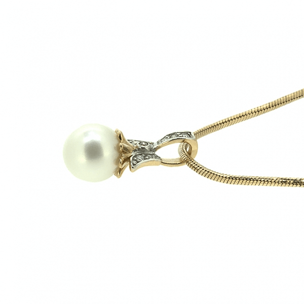 Miniaturanhänger aus Rotgold mit Perle und Diamanten.