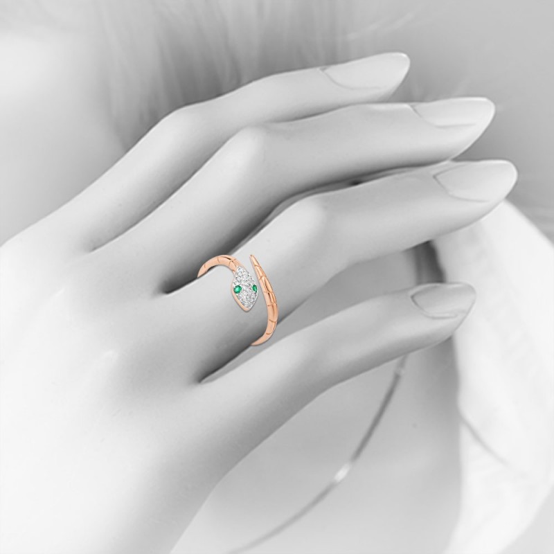 Goldring 585 in Deutschland Smaragd und Diamanten. 585er Rotgold mit Weißgoldakzenten, die die Schönheit der Steine ​​perfekt zur Geltung bringen. Ein sehr zarter und stilvoller Goldring mit einem leuchtenden Smaragd und funkelnden Diamanten. Smaragd symbolisiert Weisheit und Diamanten symbolisieren Wohlstand, daher ist ein Geschenk in Form eines Goldrings mit solchen Steinen ein würdiges Geschenk!