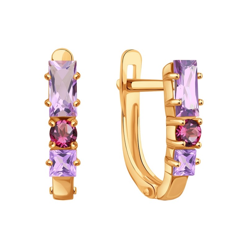 Rotgold 585 Amethyst Rhodolith. Zarte Goldohrringe aus rotem russischem Gold 585, verziert mit Amethyst, Rhodolith! Diese Ohrringe strahlen Chic und Unwiderstehlichkeit aus – Sie werden damit sowohl im Alltag als auch in festlicher Kleidung attraktiv sein!