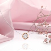Rotgold gefertigt, mit Diamanten auf Weißgoldhintergrund verziert. Dank der transparenten, kaum wahrnehmbaren Nylonkette scheint der Anhänger buchstäblich in der Luft zu schweben.