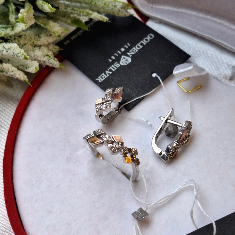 Silberset mit Gold Zirkonia. Ein bezauberndes Silberset mit rotgoldenen Akzenten, bestehend aus Ohrringen und einem Ring, mit Einsätzen aus einem unglaublich schönen Zirkonia. 925er Sterlingsilber, 375er Gold. Eine wunderbare romantische Ergänzung für Ihren Look!