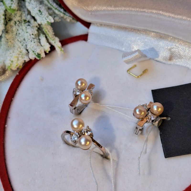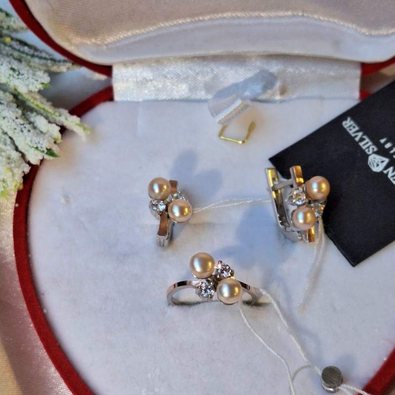 Silberset mit Gold Zirkonia Perle. Ein bezauberndes Silberset mit rotgoldenen Akzenten, bestehend aus Ohrringen und einem Ring, mit Einsätzen aus unglaublich schönen Zirkonia und pfirsichfarbigen natürlichen Zuchtperlen. 925er Sterlingsilber, 375er Gold. Eine wunderbare romantische Ergänzung für Ihren Look!