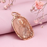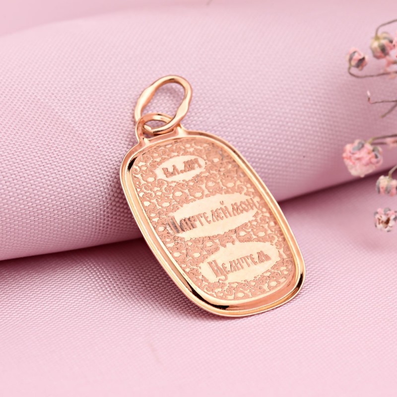 Goldikone Panteylemon Ikonenanhänger aus 14 Karat rotem russischem Gold mit farblosen Emaille. Oben am Anhänger befindet sich ein Kettenring.