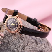 Goldene Damenuhr. Elegante goldene Quarzuhr. Das Armband besteht aus echtem weichem Leder und das Gehäuse aus 585er