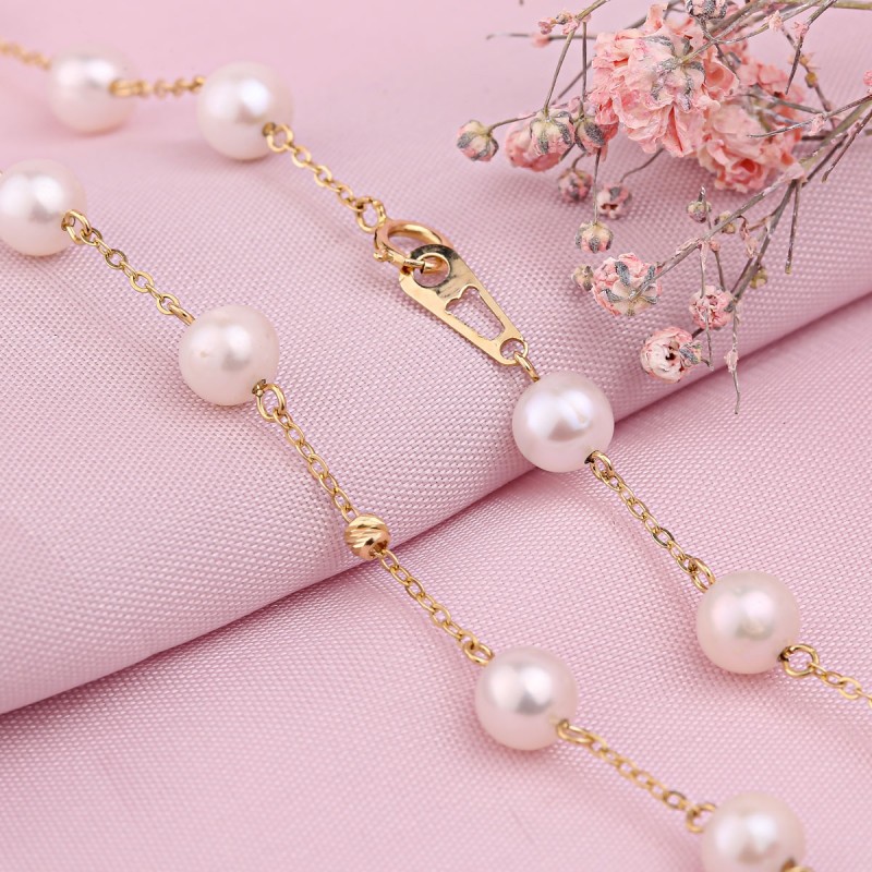 Goldcollier Gelbgold Russisches Gold 585 Perlen. Elegante Goldcollier aus 585er Gelbgold mit Einsätzen aus bezaubernden Zuchtperlen, an einer diamantgeschliffenen Ankerkette aus 585er Gelbgold, verziert mit diamantgeschliffenen Goldkugeln.