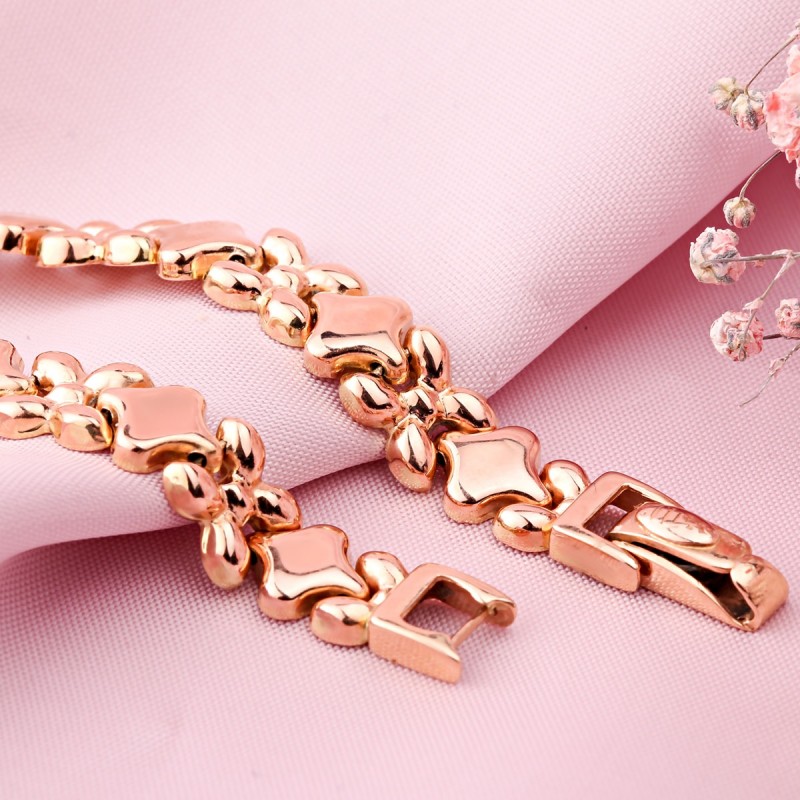 Der Wert von Rotgold liegt in seiner Stärke, Widerstandsfähigkeit gegen Lasten und Haltbarkeit. Diese Vorteile ermöglichen es Ihnen, leichten durchbrochenen Schmuck zu kreieren, ohne befürchten zu müssen, dass das Material schnell seine Form verliert oder geätzt wird.Schmuck aus rotem Material sieht toll aus, auch wenn er nicht von Edelsteinen instruiert wird. Solche Produkte eignen sich für jede Art von Haut, schmücken eine Frau jeden Alters und geben den Anschein von Raffinesse und Eleganz.