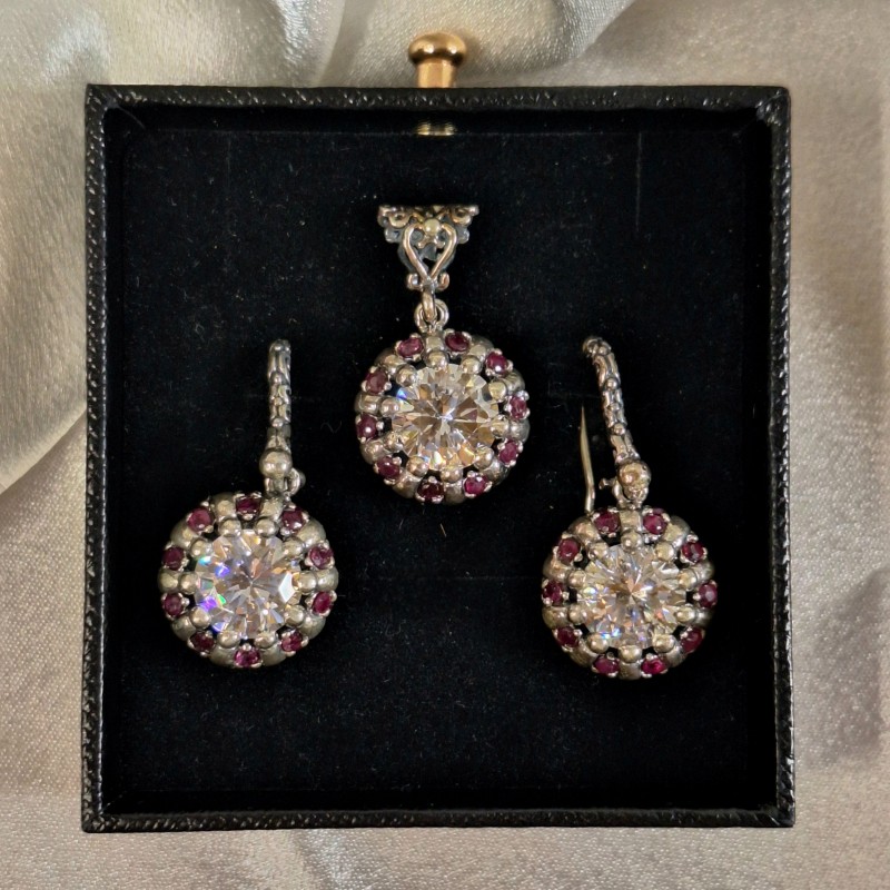Set aus 925er Silber Zirkonia Rubin. Ein schicker ethnischer Set im osmanischen Stil von handgefertigt aus geschwärztem 925er Silber mit einem großen Einsatz aus funkelnden Zirkonia und Rubinen. Das Set besteht aus einem Anhänger und Ohrhängern mit einem französischen Schloss.