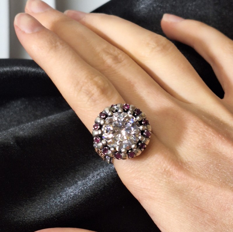 Ring aus 925er Silber Zirkonia Rubin. Ein schicker ethnischer Ring im osmanischen Stil von handgefertigt aus geschwärztem 925er Silber mit einem großen Einsatz aus funkelnden Zirkonia, Rubinen und Bronzefiligran. Frauen haben lange versucht, ihre Schönheit, Zerbrechlichkeit und ihren Charme mit Schmuck zu betonen. Orientalischer Damenschmuck hat viele Gesichter. Sie können sowohl Anmut und Bescheidenheit als auch Extravaganz des Bildes betonen. Schmuck im orientalischen Stil wurde traditionell von Juwelieren in Form von ganzen Sets hergestellt, darunter Armbänder, Ohrringe, Ringe und Halsketten. So erlangten schöne orientalische Frauen eine beeindruckende Helligkeit.