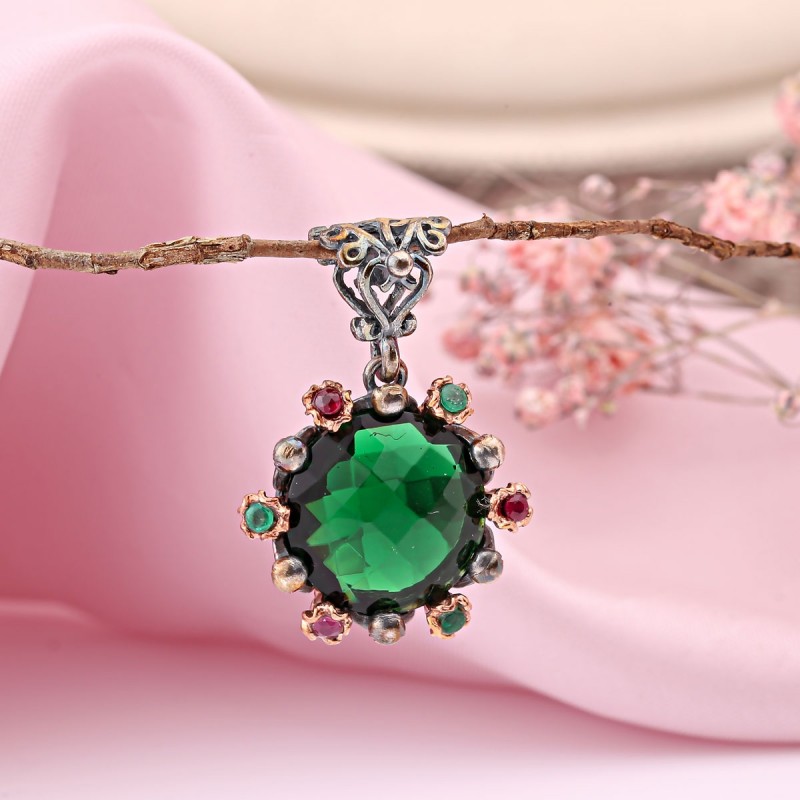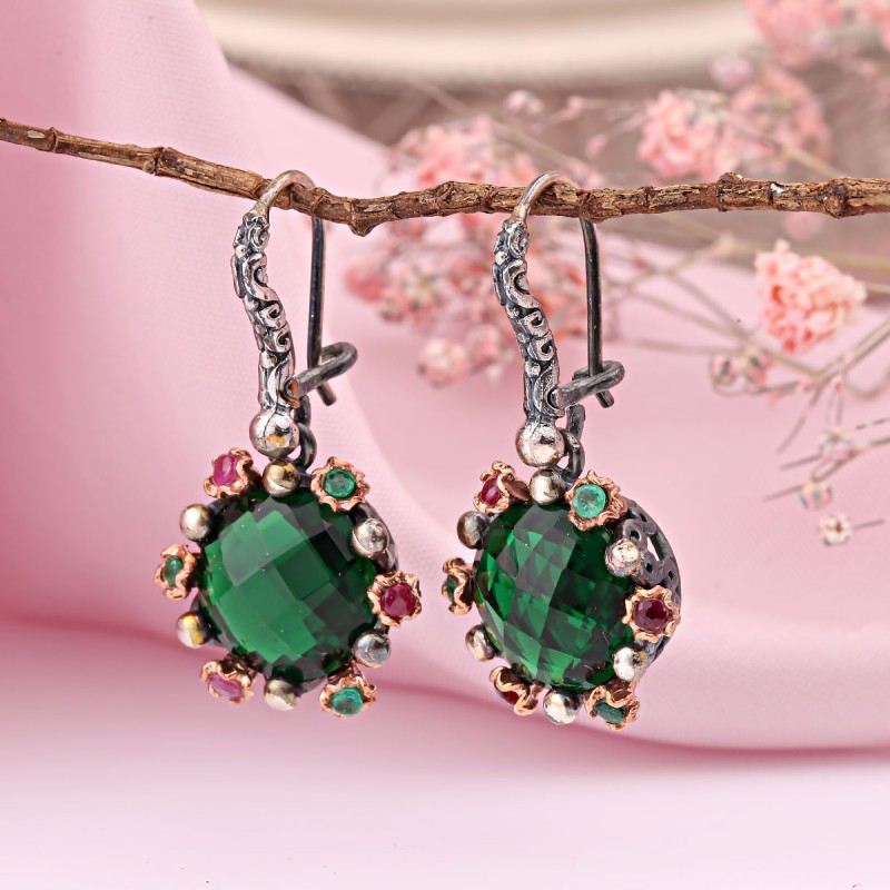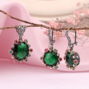 Set aus 925er Silber Zirkonia Smaragd Rubin. Ein schicker ethnischer Set im osmanischen Stil von handgefertigt aus geschwärztem 925er Silber mit einem großen Einsatz aus grünem Zirkonia in Bronzeumrandung, Rubinen, Smaragd. Das Set besteht aus einem Anhänger und Ohrhängern mit einem französischen Schloss.