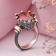 Ring aus 925er Silber Zirkonia Granat. Ein schicker ethnischer Ring im osmanischen Stil von handgefertigt aus geschwärztem 925er Silber mit einem großen Einsatz aus funkelnden Granat und Zirkonia. Frauen haben lange versucht, ihre Schönheit, Zerbrechlichkeit und ihren Charme mit Schmuck zu betonen. Orientalischer Damenschmuck hat viele Gesichter. Sie können sowohl Anmut und Bescheidenheit als auch Extravaganz des Bildes betonen. Schmuck im orientalischen Stil wurde traditionell von Juwelieren in Form von ganzen Sets hergestellt, darunter Armbänder, Ohrringe, Ringe und Halsketten. So erlangten schöne orientalische Frauen eine beeindruckende Helligkeit.