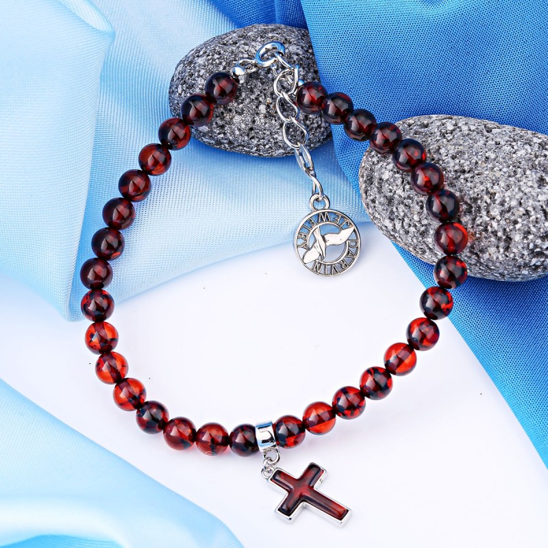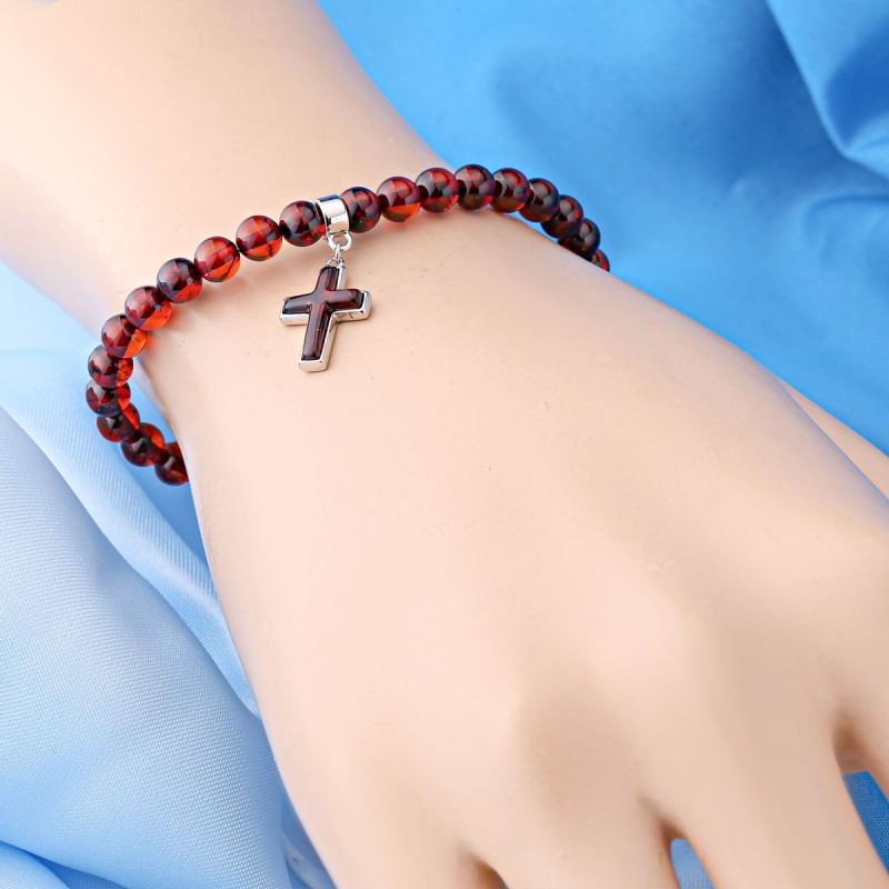 Silberarmband 925 mit Bernstein. Ein Armband aus 925er Silber verziert mit cognacfarbigem Bernstein und Bernsteinkreuz in einem Silberrahmen.