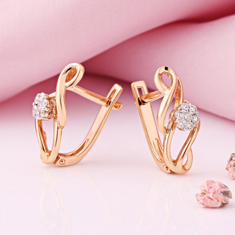 Rotgold 585 mit wunderschönen Diamanten und Weißgoldakzenten. Die ideale Abrundung des Bildes einer stilvollen Frau, die gerne ihr Aussehen verändert, sind Ohrringe mit Diamanten aus 585er Gold. Dieser ausdrucksstarke und raffinierte Accessoir eignet sich für Frauen jeden Alters, die interessante Designs und makellose Steine schätzen.