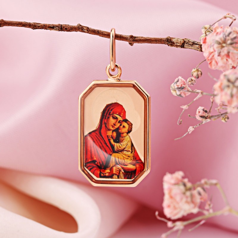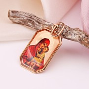 Goldikone Ikonenanhänger aus 14 Karat rotem russischem Gold mit farblosen Emaille. Oben am Anhänger befindet sich ein Kettenring.