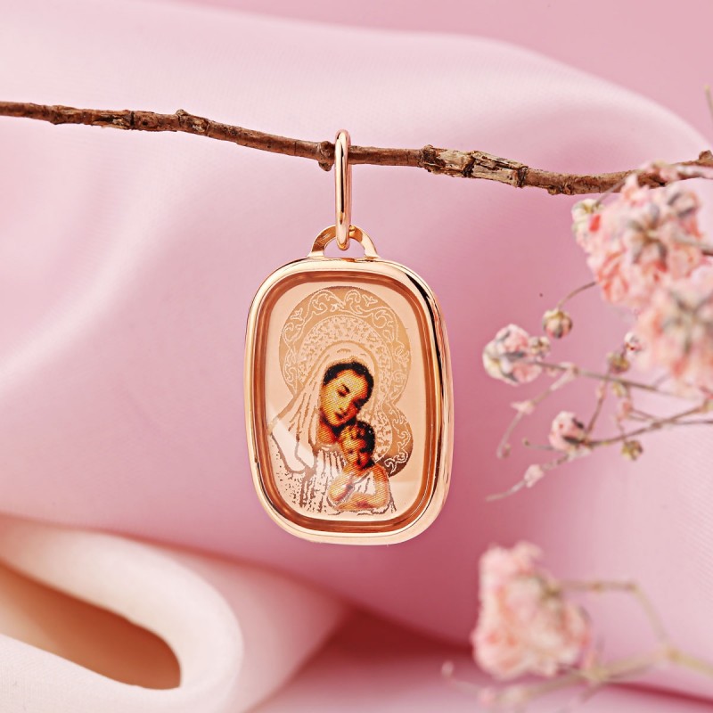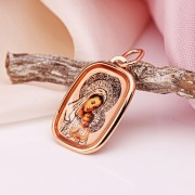 Goldikone Ikonenanhänger aus 14 Karat rotem russischem Gold mit farblosen Emaille. Oben am Anhänger befindet sich ein Kettenring.