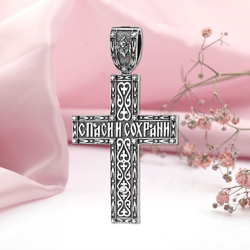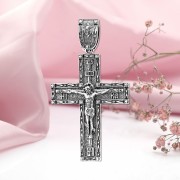 Silbernes Brustkreuz mit einem Kruzifix aus geschwärztem 925er Silber! Auf der Rückseite ist die Inschrift eingraviert: "Rette und bewahre". Kratzt nicht beim Tragen.