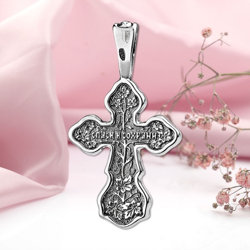 Silbernes Brustkreuz mit einem Kruzifix aus geschwärztem 925er Sterlingsilber! Auf der Rückseite befindet sich die Inschrift auf Russisch: „Rette und bewahre.“ Kratzt beim Tragen nicht.
