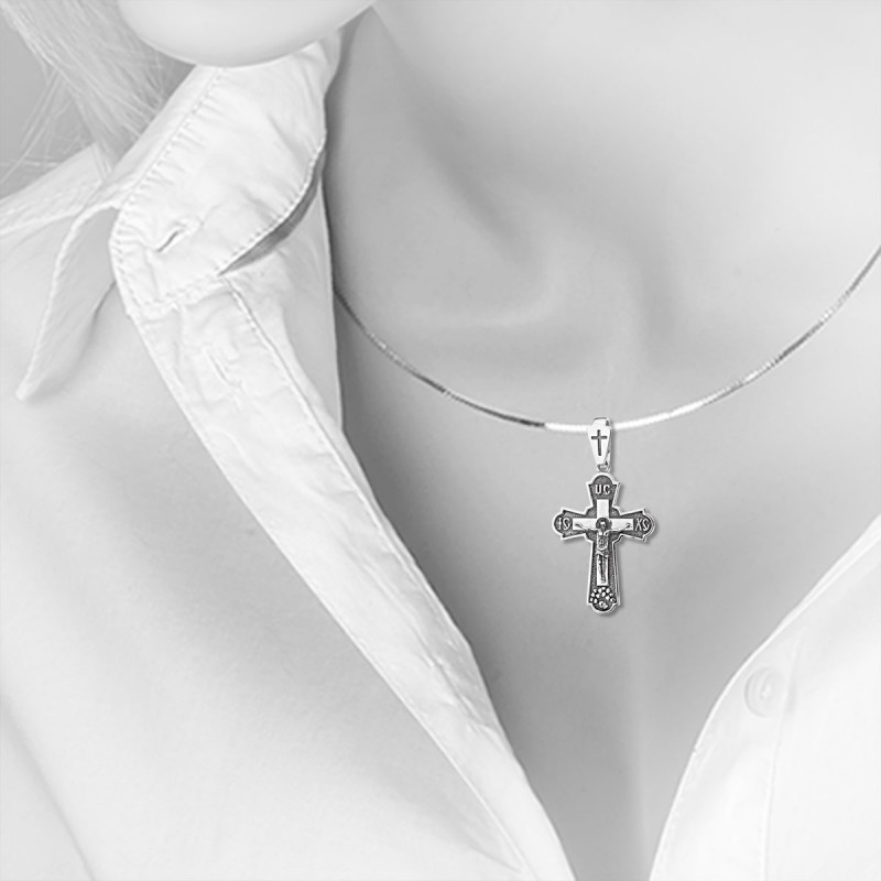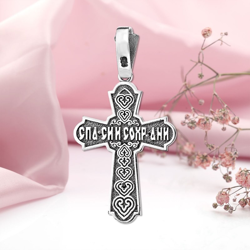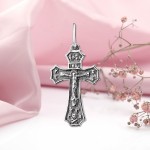 Silbernes Brustkreuz mit einem Kruzifix aus geschwärztem 925er Sterlingsilber! Auf der Rückseite befindet sich die Inschrift auf Russisch: „Rette und bewahre.“ Kratzt beim Tragen nicht.