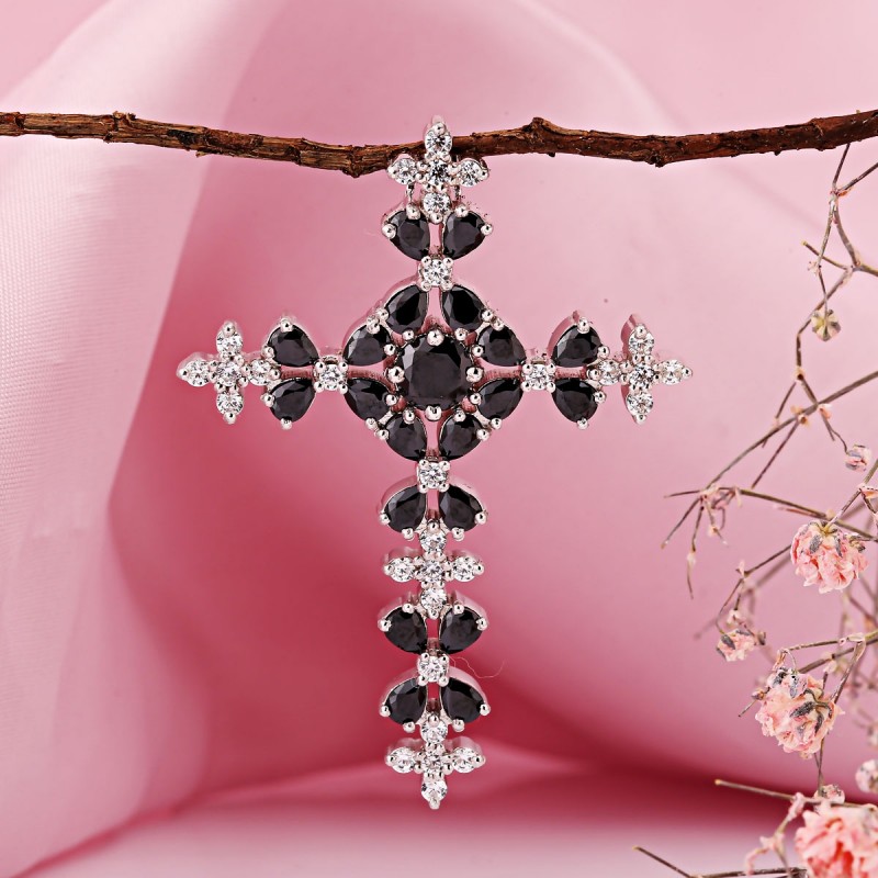 Silbernes Brustkreuz aus 925er Sterlingsilber mit Zirkonia! Schwarze und weiße Zirkonia. Ein schwarzer Edelstein wird sicherlich Aufmerksamkeit erregen, da solcher Schmuck nicht so weit verbreitet ist. Schwarze Steine ​​sehen in Weißgold und Silber toll aus, besonders in Kombination mit farblosen Steinen. Kratzt beim Tragen nicht.