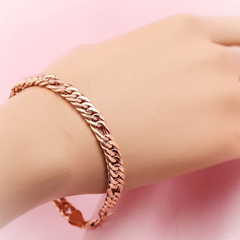 Rotgold mit funkelndem Diamantschliff als Panzewrgeflecht mit Figarooptik. Armbänder aus Gold setzen den nötigen Akzent im Bild und machen auf den Reichtum und Luxus der Accessoires aufmerksam, denn Gold ist schön, stilvoll, schick und teuer. Passt sowohl einer soliden Dame als auch einer jungen Frau.