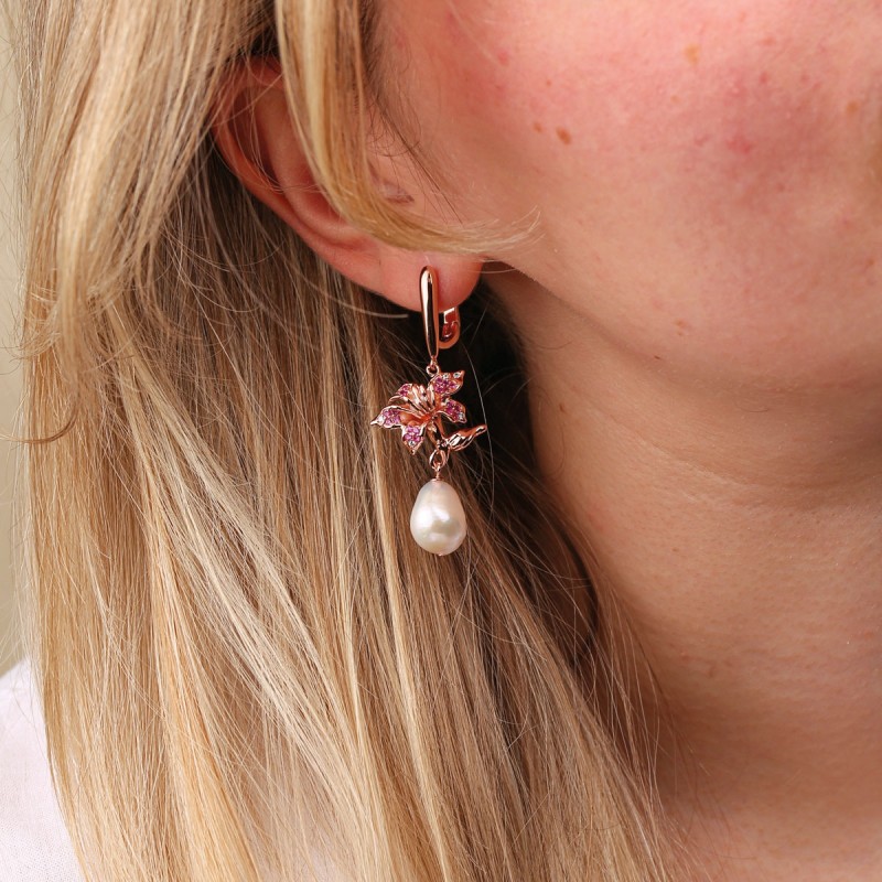 Perlenohrringe vergoldet Chervona Ruta. Ohrhänger aus rotvergoldetem 925er Silber mit Barockperlen & Zirkonia