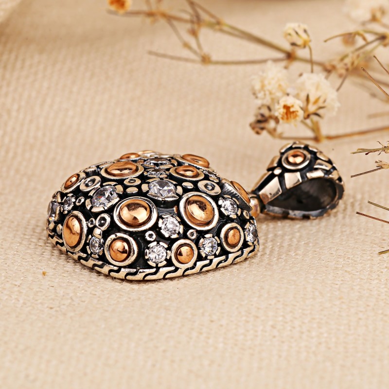 Dieser ethnische Anhänger wurde sorgfältig aus geschwärztem 925er Silber gefertigt und mit feinen Bronzeakzenten sowie funkelnden Zirkonia-Steinen veredelt. Er vereint östliche Pracht und feinen Stil und betont die Individualität und Weiblichkeit seiner Trägerin.