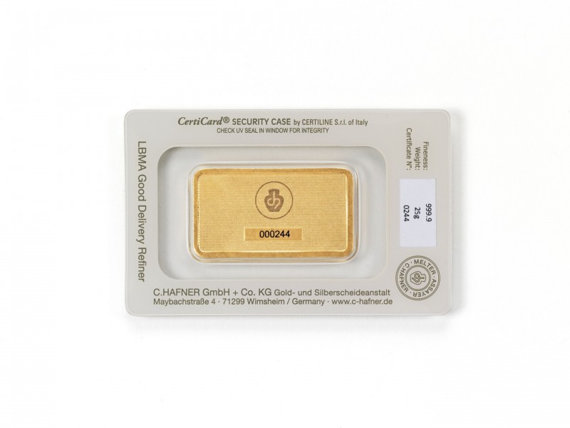 Größe der Barren, ca.: 44,00 mm x 25,0 mm x 3,0 mm, Gewicht 25,0 Gramm.
