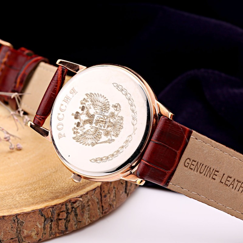 Herrenarmbanduhr „Russland“ – ein stilvolles Accessoire mit dem Wappen der Russischen Föderation. Klassisches Design mit vergoldetem Gehäuse, silbernem Zifferblatt und Datumsanzeige. Ein elegantes Geschenk für Liebhaber von Tradition und Symbolkraft.