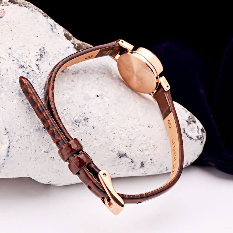 Die feine, reliefartige Lünette verleiht der Uhr zusätzlichen Charme, während das Armband aus echtem Leder in edlem Braun für angenehmen Tragekomfort im Alltag sorgt.