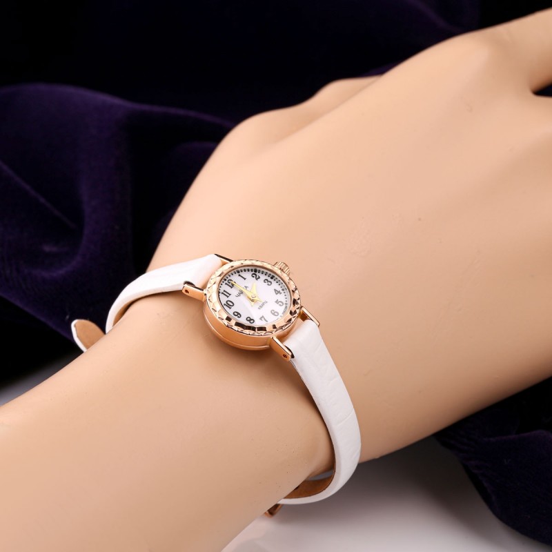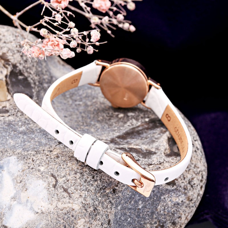 Rotgold unterstreicht die Exklusivität und den besonderen Charakter der Uhr. Das weiße Zifferblatt mit klaren arabischen Ziffern und goldfarbenen Zeigern sorgt für hervorragende Ablesbarkeit. Ein fein gearbeiteter, reliefierter Lünettenrand verleiht der Uhr zusätzlichen Charme. Das weiße Lederarmband bietet hohen Tragekomfort im Alltag.