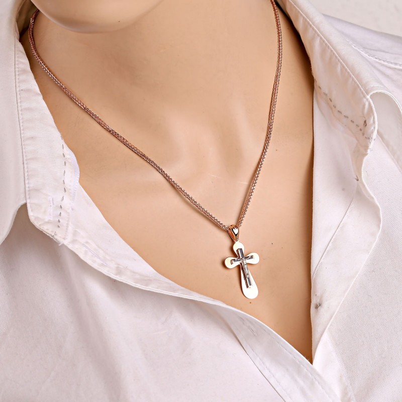 Rotgold hat einen warmen, weichen Farbton, der auf der Haut besonders edel wirkt. In Kombination mit weißen Goldelementen entsteht ein raffinierter Kontrast und ein feiner Glanz. Diese Farbkombination betont die Linien des Kreuzes und verleiht dem Schmuckstück Tiefe und Modernität. Es eignet sich sowohl für den täglichen Gebrauch als auch für festliche Anlässe.
