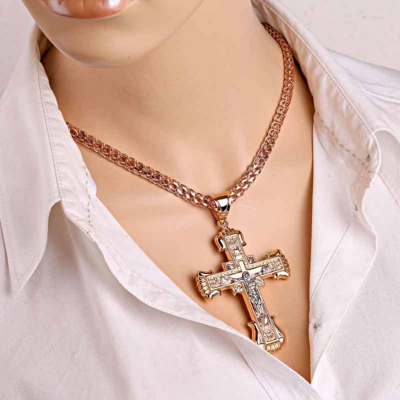 Kreuzanhänger mit Goldkette 585. Das große Kreuz besteht aus Rotgold 585 mit einem Korpus aus Weißgold 585 und der Inschrift INRI. Auf der Rückseite befindet sich die Gravur „Rette und bewahre“ (russisch: „Спаси и сохрани“).