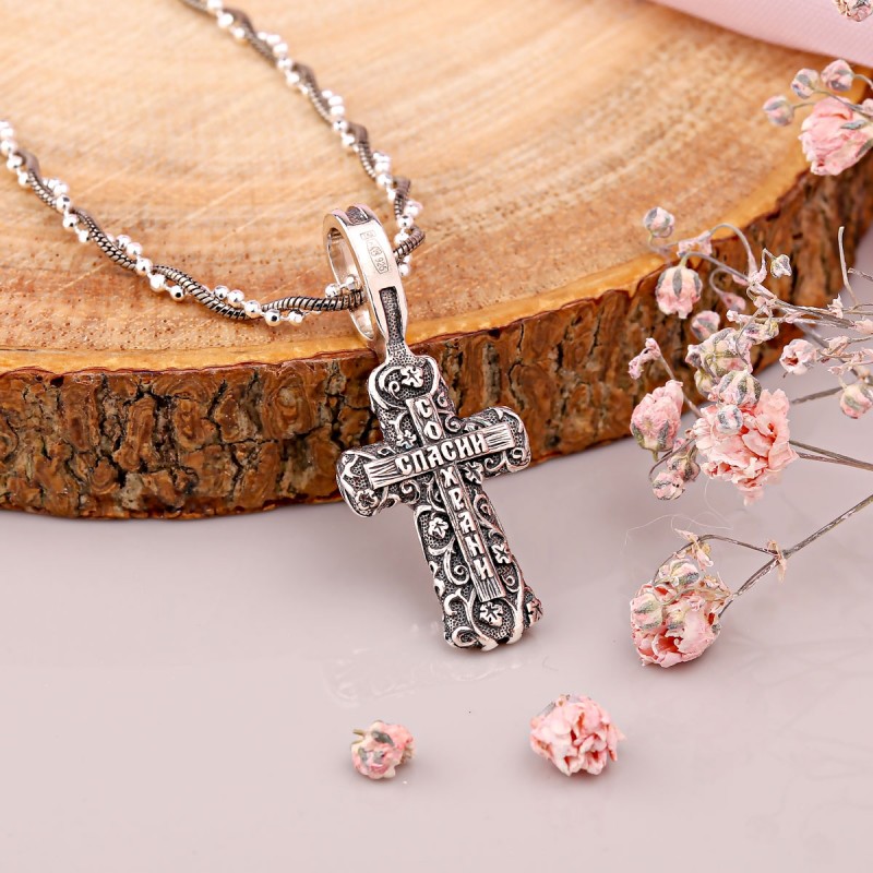 Das Kreuz mit Korpus besteht aus geschwärztem Sterlingsilber (925) und ist mit einem dekorativen Muster aus Wirbeln und feinen Punkten versehen, das dem Schmuckstück einen antiken, vintageartigen Charakter verleiht. Auf der Rückseite befindet sich die Gravur „Rette und bewahre“.