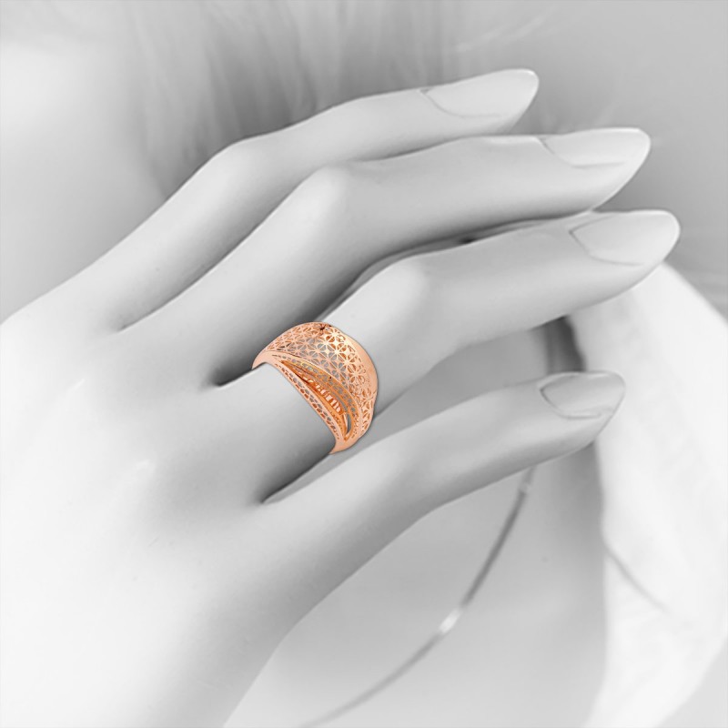 Rotgold – ein Schmuckstück, das sofort Aufmerksamkeit auf sich zieht dank seines außergewöhnlichen, voluminösen Designs und der feinen dekorativen Verarbeitung. Mehrere elegant geschwungene Goldbänder kreuzen sich und formen eine harmonische Komposition, die zugleich dynamisch und raffiniert wirkt.