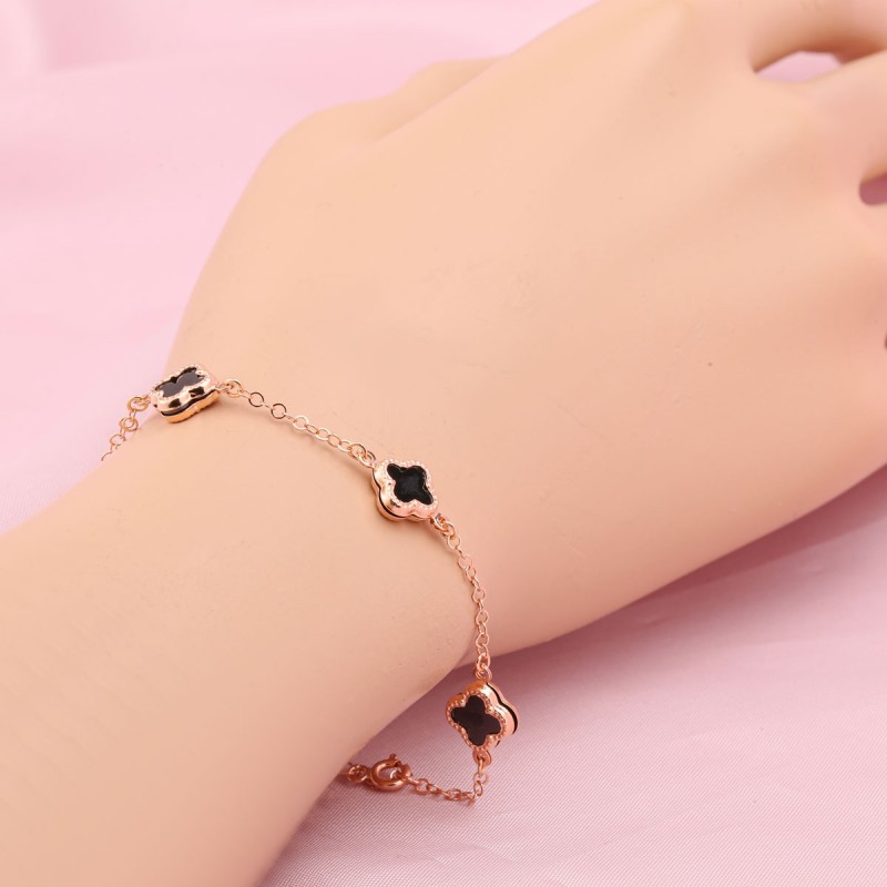 Die feine Belcher-Kette schmiegt sich sanft um das Handgelenk, während die zarten Vierblatt-Elemente aus tiefschwarzem Onyx einen stilvollen Kontrast zum warmen Glanz des Goldes schaffen.