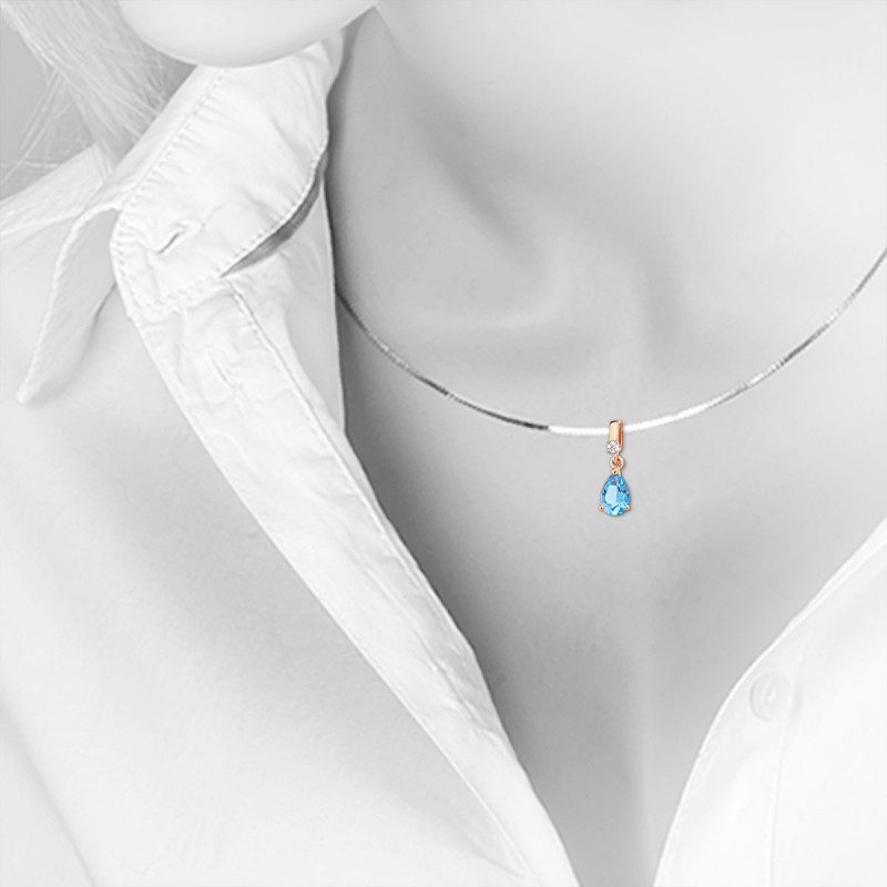 Über dem Topas funkelt ein Diamant mit Rhodiumakzenten, so rein und strahlend wie ein kleiner Lichtfunke. Er verleiht dem Anhänger edlen Glanz, betont die Klarheit des blauen Steins und rundet die Komposition zu einem harmonischen, luxuriösen Gesamtbild ab.