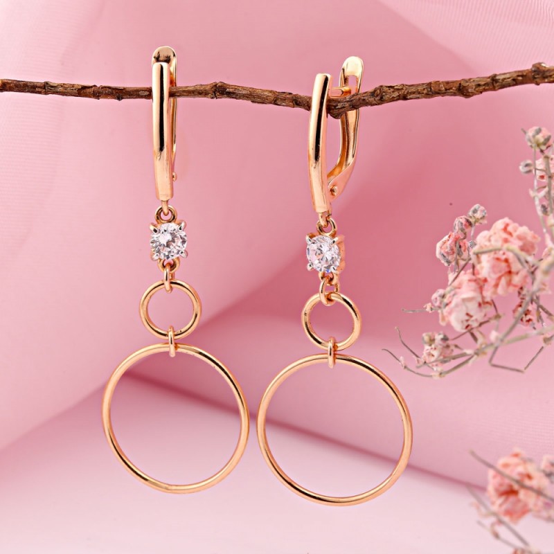 Gold 585 Ohrhänger Zirkonia. Diese Ohrhänger vereinen moderne Leichtigkeit mit eleganter Geometrie. Die sanft schwingenden Kreise formen eine luftige Silhouette, während ein brillant funkelnder Zirkonia im Zentrum den Blick anzieht. Die Fassung des Steins ist mit einer edlen Rhodium-Beschichtung veredelt, die einen kühlen Schimmer erzeugt und einen raffinierten Kontrast zum warmen 585er Rotgold bildet.