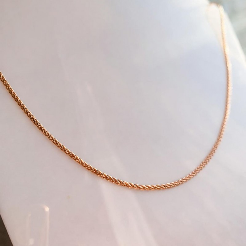 Rotgold 585 Ähre. Diese Goldkette steht für zeitlose Eleganz und raffinierte Zurückhaltung. Das flache Flechtmuster „Kolos“ bildet eine dichte, harmonische Struktur, die an kunstvoll verflochtene Goldstränge erinnert. Die Oberfläche liegt sanft auf der Haut und verleiht dem Schmuckstück eine edle, gleichmäßige Ausstrahlung.