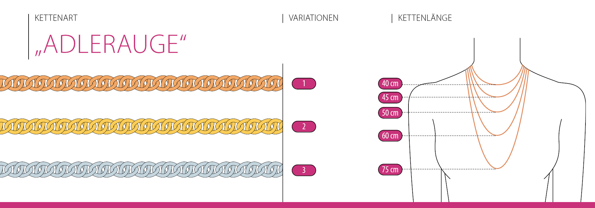 Genau wie im klassischen Muschelgeflecht sind im Adlerauge die Glieder nacheinander in einer Ebene miteinander verbunden, haben einen doppelseitigen Diamantschliff und die Dekoration selbst ist flach.