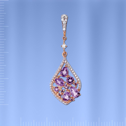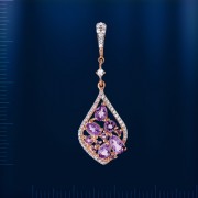 Вставки: Аметист груша (5.0 х 3.0 мм 0.038), аметист (¢ 1.75 мм 0.004), аметист (¢ 2.0 мм 0.006), аметист (¢ 3.0 мм 0.02), 4 аметиста (¢ 1.25 мм 0.004), аметиста овал (4.0 х 3.0 мм 0.031), 2 аметиста (груша 4.0 х 3.0 мм 0.052), сверкающий фианит ¢ 1.75 мм 0.008, 7 сверкающих фианитов ¢ 1.0 мм 0.014, 36 сверкающих фианитов ¢ 0.8 мм 0.036