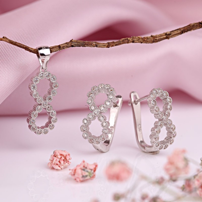 Серебряный гарнитур 925 пробы, состоящий из подвески и серег со вставками сверкающих